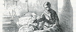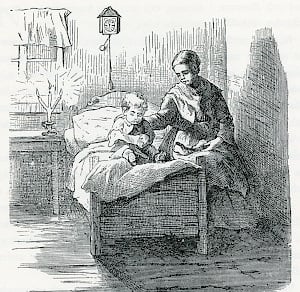 The Julvätten now recounted how Mother Gertrude on the heath, though penniless, had taken little Vigg under her wing, fatherless and motherless as he was. He told how she braided rugs and bound brooms to sell at the general store so she could provide food for him, and how she sewed and patched his clothes, how she labored with joy and love, and how she bore sacrifices for his sake. How she rejoiced in his lively nature and bold heart and red cheeks and faithful eyes and gladly forgave him his boyish mischief – yes, every night before she slept she prayed to God for him. And on that very day she had traveled far away through the ice cold winter to the village, just to bring him a candle and a few other little things to brighten him up that Christmas Eve.