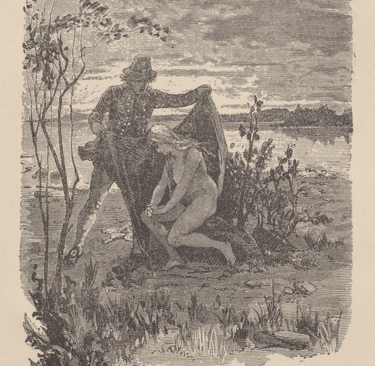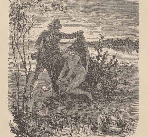 From his hiding place, the hunter took note where the woman of his desire had laid her swan shape and slowly crept up, took it, and hid himself in the woods.