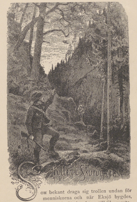Here it seemed they would be able to enjoy the peace and quiet, for the place was lonely and bleak. Two great mountains rose straight up so close to each other that the little sunlight that does manage to make it down to the bottom of the “street,” as the narrow lane is called, is but a twilight. But the bold grenadiers of Småland have not left the trolls in peace even there, for I have heard that when the army met on Ränneslätt the entire battalion would march through the street with drums and trumpets several times, indeed, they would even fire their rifles down there, which shook the very hearts of the trolls living in the mountains. Thus, I doubt the trolls enjoyed well-being, even in Skurugata.